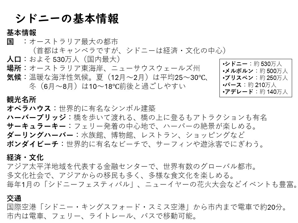 シドニーはオーストラリア最大の経済・文化の都市で国内最大の530万人の人口を誇ります。